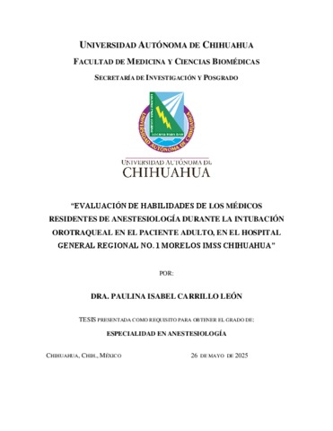 CARRILLO LEÓN, PAULINA ISABEL (2025) EVALUACIÓN DE HABILIDADES DE LOS MÉDICOS RESIDENTES DE ANESTESIOLOGÍA DURANTE LA INTUBACIÓN OROTRAQUEAL EN EL PACIENTE ADULTO, EN EL HOSPITAL GENERAL REGIONAL NO. 1 MORELOS IMSS CHIHUAHUA. Especialidad thesis, Universidad Autónoma de Chihuahua.