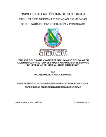 VARELA ESPINOZA, ALEJANDRO (2025) EFICACIA DE LOS AINE VS OPIOIDES EN EL MANEJO DEL DOLOR EN PACIENTES CON FRACTURA DE CADERA ATENDIDOS EN EL SERVICIO DE URGENCIAS DEL HGR No. 1 IMSS CHIHUAHUA. Especialidad thesis, Universidad Autónoma de Chihuahua.