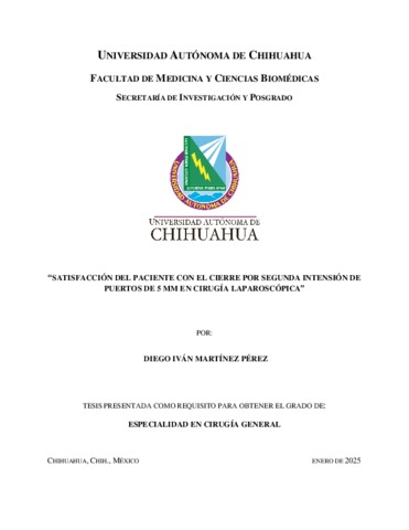 MARTÍNEZ PÉREZ, DIEGO IVÁN (2025) SATISFACCIÓN DEL PACIENTE CON EL CIERRE POR SEGUNDA INTENSIÓN DE PUERTOS DE 5 MM EN CIRUGÍA LAPAROSCÓPICA. Especialidad thesis, Universidad Autónoma de Chihuahua.