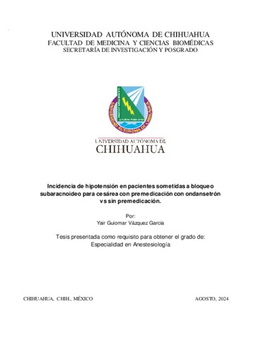 VÁZQUEZ GARCÍA, YAIR GUIOMAR (2025) INCIDENCIA DE HIPOTENSIÓN EN PACIENTES SOMETIDAS A BLOQUEO SUBARACNOIDEO PARA CESÁREA CON PREMEDICACIÓN CON ONDANSETRÓN VS SIN PREMEDICACIÓN. Especialidad thesis, Universidad Autónoma de Chihuahua.