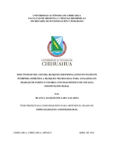 LARA GALARZA, BLANCA JACQUELINE (2025) EFECTIVIDAD DEL USO DEL BLOQUEO ESFENOPALATINO EN PACIENTE PUÉRPERA SOMETIDA A BLOQUEO NEUROAXIAL PARA ANALGESIA EN TRABAJO DE PARTO O CESÁREA CON DIAGNÓSTICO DE CEFALEA POSTPUNCIÓN DURAL. Especialidad thesis, Universidad Autónoma de Chihuahua.