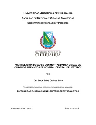 CHÁVEZ BACA, ERICK ELÍAS (2025) CORRELACIÓN DE SAPS 3 CON MORTALIDAD EN UNIDAD DE CUIDADOS INTENSIVOS DE HOSPITAL CENTRAL DEL ESTADO. Especialidad thesis, Universidad Autónoma de Chihuahua.