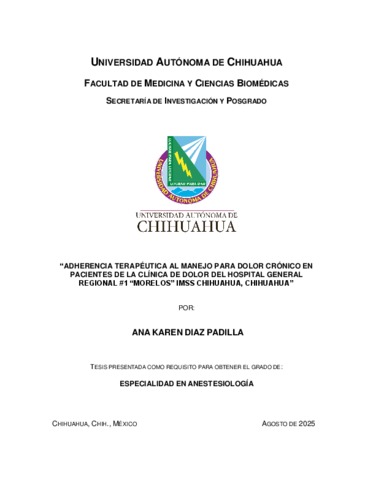 DÍAZ PADILLA, ANA KAREN (2025) ADHERENCIA TERAPÉUTICA AL MANEJO PARA DOLOR CRÓNICO EN PACIENTES DE LA CLÍNICA DE DOLOR DEL HOSPITAL GENERAL REGIONAL #1 “MORELOS” IMSS CHIHUAHUA, CHIHUAHUA. Especialidad thesis, Universidad Autónoma de Chihuahua.