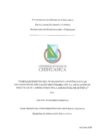MANJARREZ SANDOVAL, XOCHITL (2025) FORTALECIMIENTO DEL PENSAMIENTO CIENTÍFICO EN LOS ESTUDIANTES DE EDUCACIÓN SECUNDARIA CON LA APLICACIÓN DE PRÁCTICAS DE LABORATORIO EN LA ASIGNATURA DE QUÍMICA. Maestría thesis, Universidad Autónoma de Chihuahua.