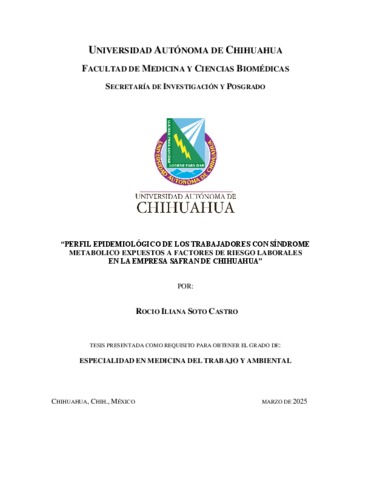 SOTO CASTRO, ROCIO ILIANA (2026) PERFIL EPIDEMIOLÓGICO DE LOS TRABAJADORES CON SÍNDROME METABÓLICO EXPUESTOS A FACTORES DE RIESGO LABORALES EN LA EMPRESA SAFRAN DE CHIHUAHUA. Especialidad thesis, Universidad Autónoma de Chihuahua.