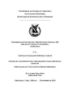 ESPINOZA CARLÓN, SANTIAGO GUADALUPE (2026) DETERMINACIÓN DE MAYOR Y MEJOR USO DE PARCELA 180 UBICADA EN CIUDAD CUAUHTÉMOC, CHIHUAHUA. Especialidad thesis, Universidad Autónoma de Chihuahua.