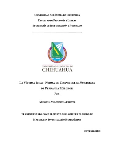 VALENZUELA CHÁVEZ, MARCELA (2026) LA VÍCTIMA IDEAL: NORMA DE TEMPORADA DE HURACANES DE FERNANDA MELCHOR. Maestría thesis, Universidad Autónoma de Chihuahua.