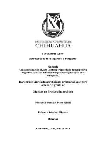 PIERUCCIONI, DAMIAN (2026) UNA APROXIMACIÓN AL JAZZ CONTEMPORÁNEO DESDE LA PERSPECTIVA ARGENTINA, A TRAVÉS DEL APRENDIZAJE AUTORREGULADO Y LA AUTO ETNOGRAFÍA. Maestría thesis, Universidad Autónoma de Chihuahua.